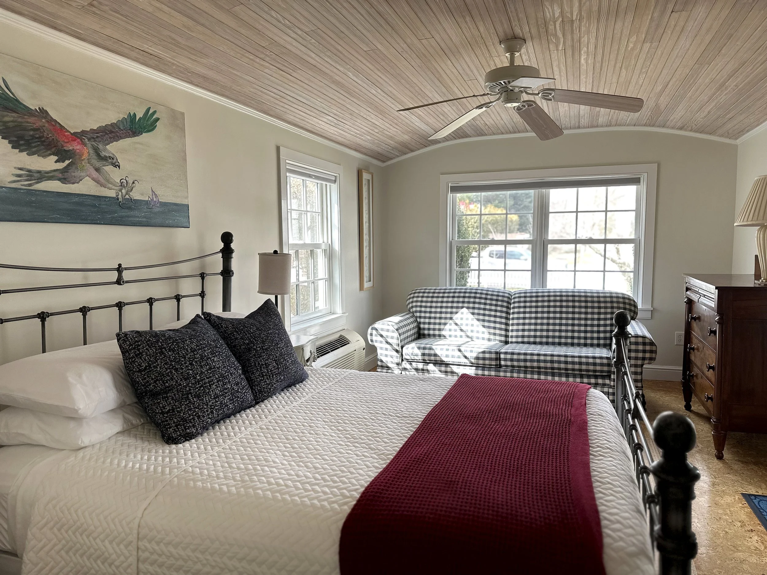 Located at the front of the guesthouse, the Osprey Room overlooks your private patio, our beautiful gardens, and out onto Orchard Street. Look up, and you’ll see the osprey returning from fishing in Little Narragansett Bay.